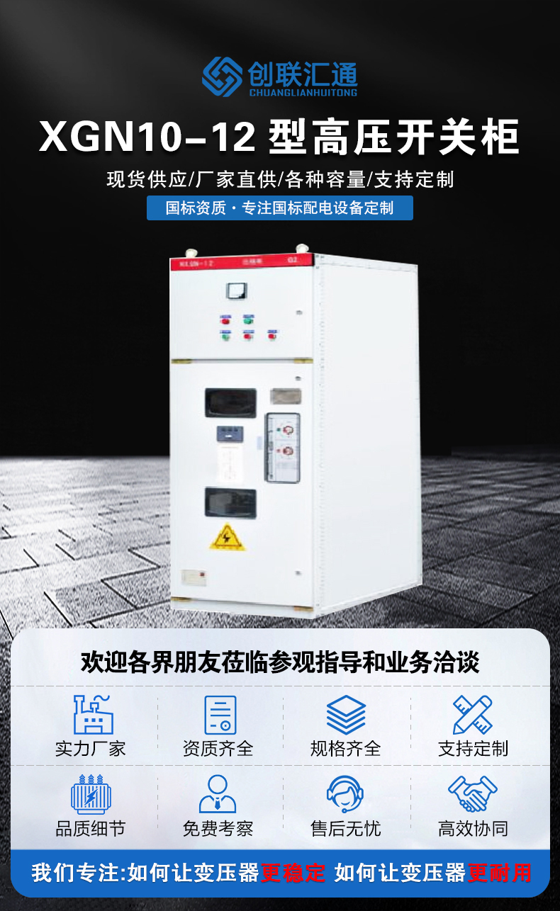 XGN2-10箱型固定式金屬封閉開關(guān)設(shè)備用于12kV及以下三相交流50Hz系統(tǒng)中作為接受與分配電能之用,特別適合于頻繁操作的場合,其母線系統(tǒng)為單母線,也可派生出單母線帶旁路和雙母線結(jié)構(gòu)。